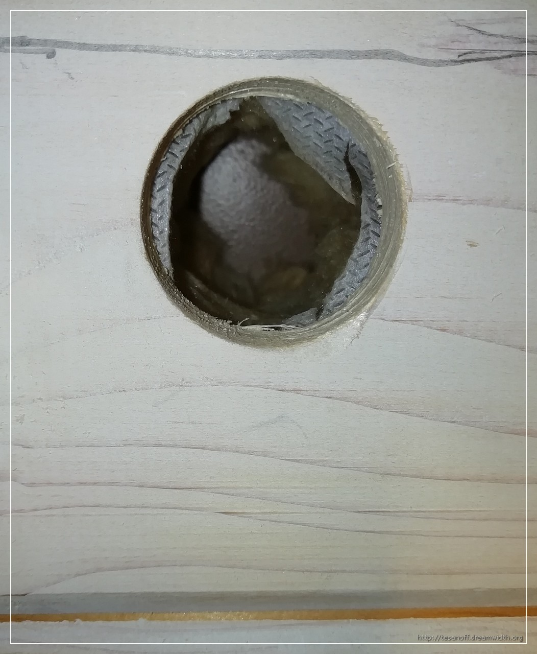 Для начала в вагонке я просверлил отверстие 35 мм. Вот какой живописный вид через него открылся: