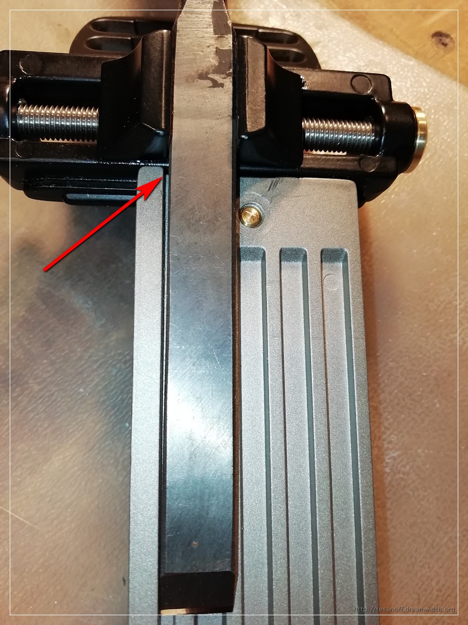 Пришлось брать напильник и подтачивать держатели. Поскольку, работая напильником без спец-приспособлений, практически гарантированно получаешь выпуклую поверхность, пришлось потом взять дремель и сделать небольшую ямку в центре держателей, чтобы получились как-бы две контактных площадки на каждой "губке" держателя. Это чтобы зажатая стамеска была плотно зажата и не болталась. Вот одна губка: